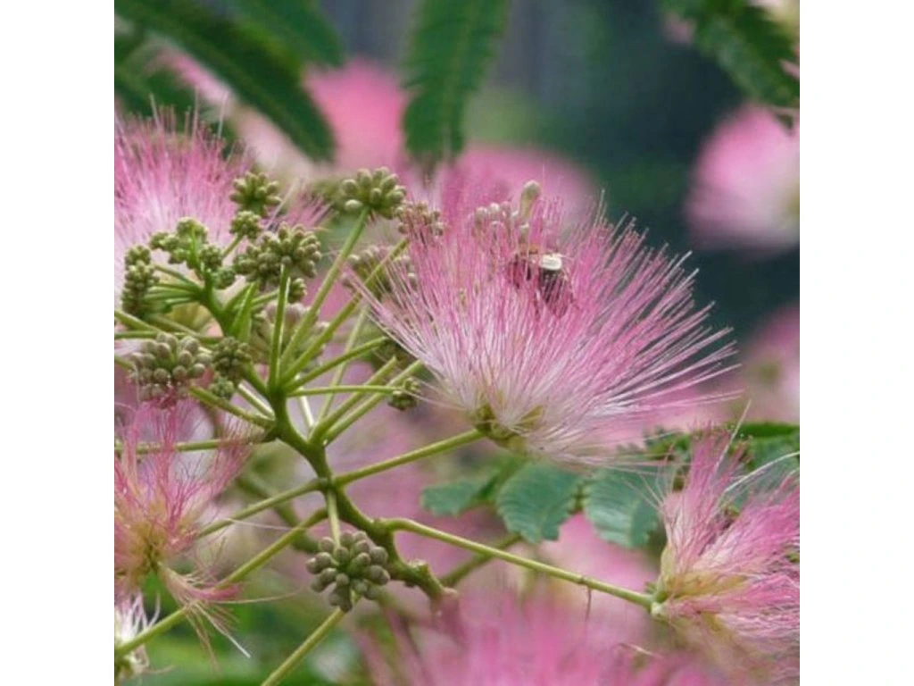 Albicia, známá jako hedvábný strom nebo také „strom štěstí“, je exotická okrasná dřevina pocházející z východní Asie, která si získala oblibu po celém světě díky svému jedinečnému vzhledu. Tato elegantní rostlina zaujme především svými jemnými, vějířovitými listy připomínajícími mimózu a nádhernými květy ve tvaru nadýchaných pomponů z růžovo-bílých vláken, které jsou navíc příjemně voňavé.